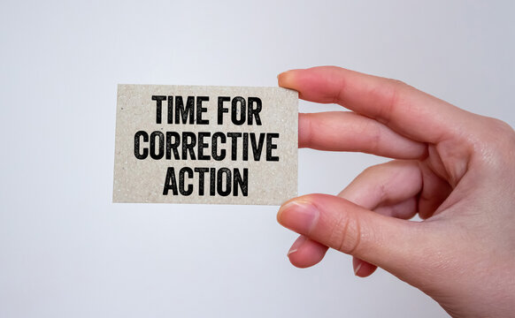 Time for corrective action message written on a card in hand. Conceptual time for corrective action symbol. Copy space.