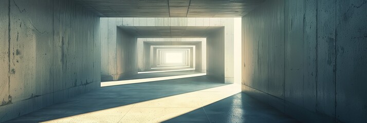 A minimalist and eerie image of a concrete tunnel with light shining through at the end. The tunnel is a symbol of hope, possibility, and the unknown. The concrete walls create a sense of confinement