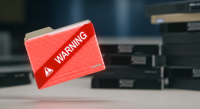 Red Data Storage Cartridge with Critical Warning Label. Digital Security Breach, Corrupted File, and Cyber Threat Risk Concept Showing Data Loss or System Failure.