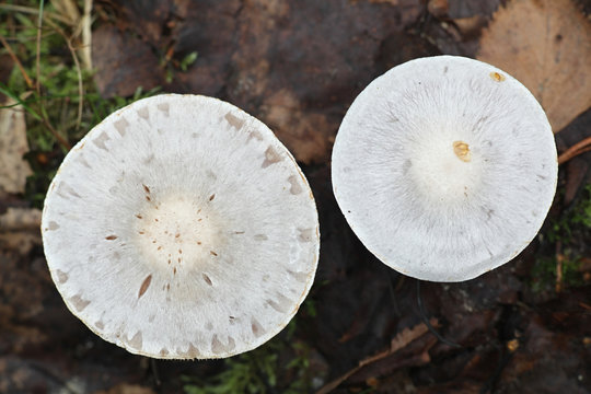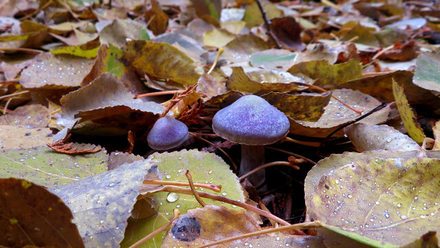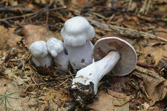 White Cortinarius alboviolaceus mushrooms growing among fallen leaves