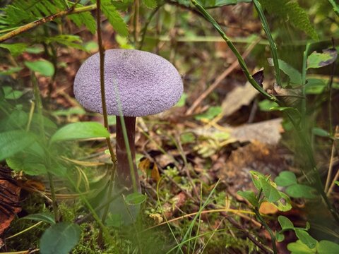 A close up low angle of a silvery violet webcap, Cortinarius alboviolaceus, type of fungi. The low angle shows the forest floor with space for copy