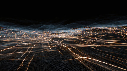 An abstract representation of a city at night, with light trails creating a sense of movement. The cityscape features numerous glowing lights and lines, suggesting networks and connections