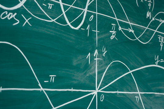 School math lesson. Trigonometry. Chalkboard Function graphs.