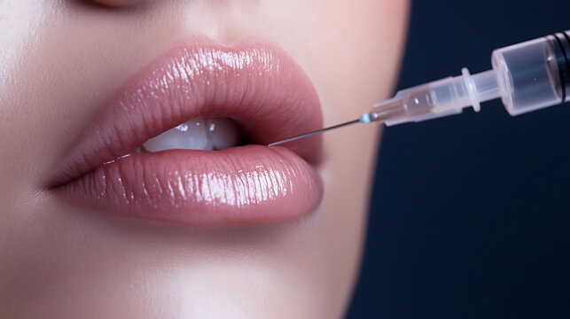 practitioner administers a cosmetic injection into the lip of a patient to enhance volume and shape, showcasing the glossy appearance of the lips and a sterile environment