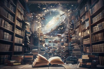 Enchanted library with books floating towards a radiant portal in space, symbolizing the power of knowledge