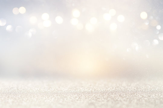 glitter vintage lights background. silver and light gold de-focused.