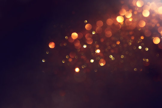 glitter vintage lights background. black and gold. de-focused.