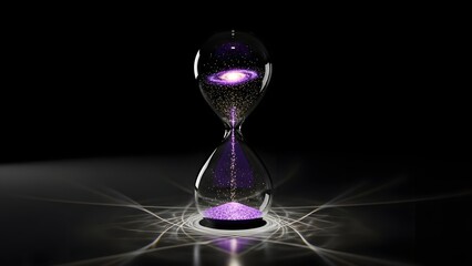 Surreal Hourglass Containing a Purple Galaxy and Sparkling Stars with Grains of Sand as Cosmic Dust on a Reflective Dark Surface