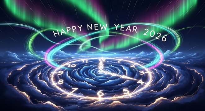 Happy new year 2026 celebration with aurora and cosmic clock