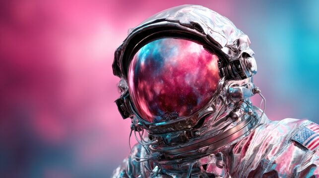 A sleek astronaut helmet reflects a vibrant cosmic galaxy filled with colors and stellar phenomena, capturing the essence of space exploration and human curiosity.