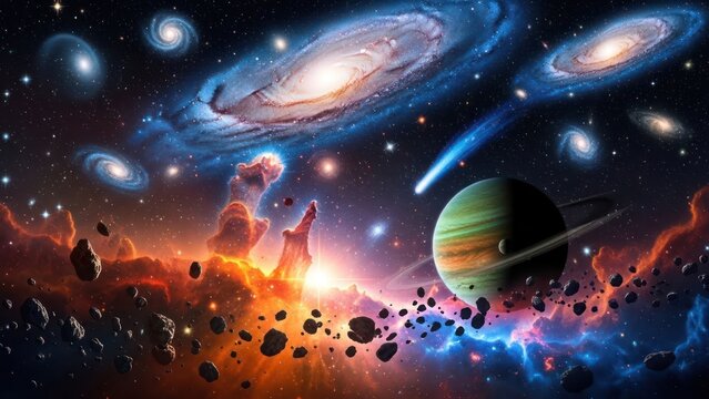 Vibrant cosmic landscape with spiral galaxies, ringed planet, asteroids, and colorful nebulae in deep space, depicting the vast universe.