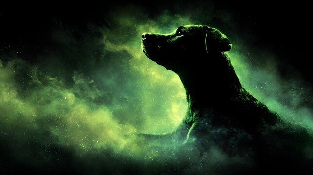 Black silhouette dog with glowing constellation stars, minimalist cosmic pet art, night sky theme