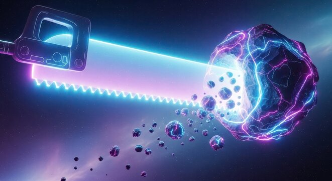 Illuminated futuristic hand tool slices through an energized cosmic rock formation in deep space