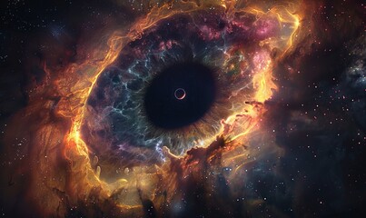 A cosmic eye nebula with concentric rings of colorful gas, central star illuminating the intricate structures