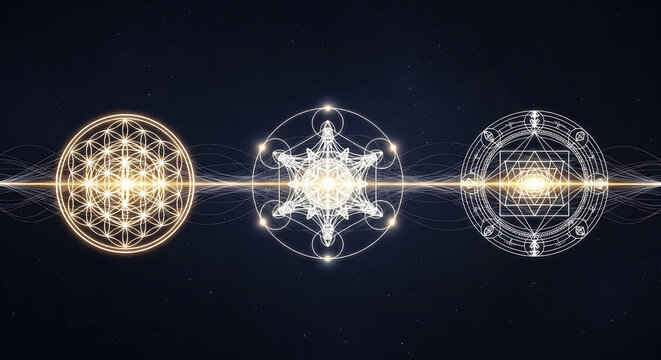 An esoteric illustration of three glowing sacred geometry symbols connected by a horizontal light beam.