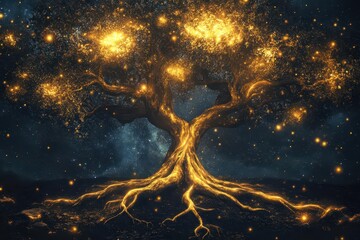 ancient cosmic tree illustration, spiraling golden roots reaching into starry cosmos, ethereal branches bearing glowing celestial fruits, mystical sacred geometry