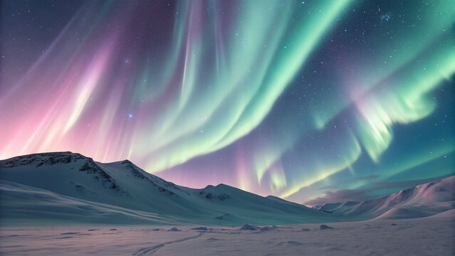 Dancing northern lights with long-exposure star trails in green teal and purple gradient