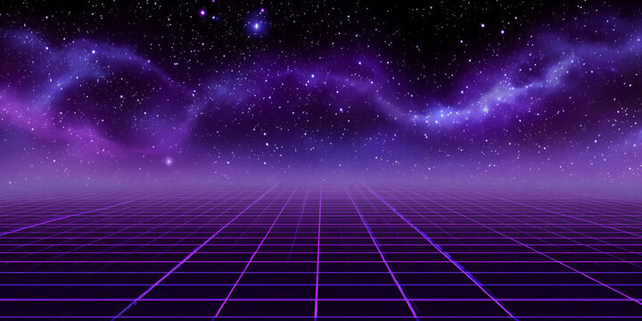 Purple grid with cosmic galaxy sky, retro futuristic background in synthwave style