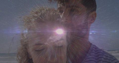 Ethereal couple embracing with cosmic light burst over ocean horizon