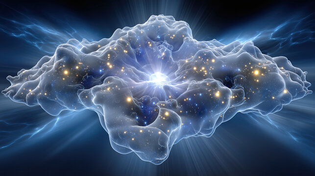 Stunning depiction of bioluminescent cloud, glowing with stars and cosmic energy, evoking sense of wonder and mystery