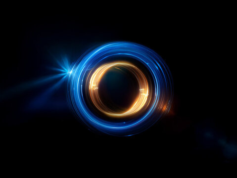 A luminous gold ring encircled by swirling blue light streaks across a black background.  The image evokes a sense of energy and motion, with bright lens flares adding to the dynamic effect.