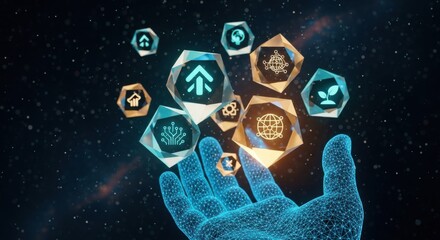 Futuristic hand reaching towards glowing digital icons in space