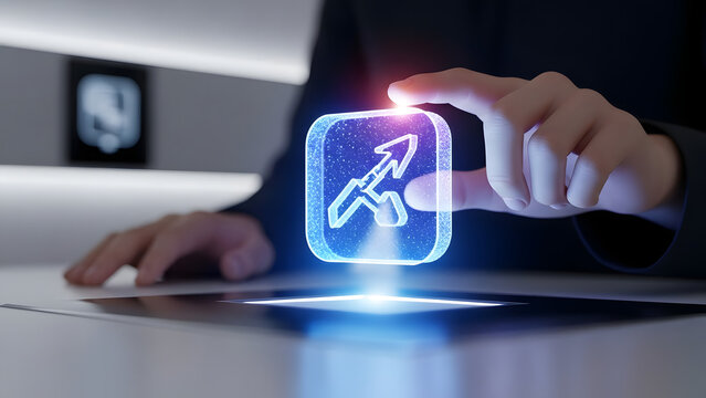 Person touching holographic Sagittarius zodiac sign icon with glowing light
