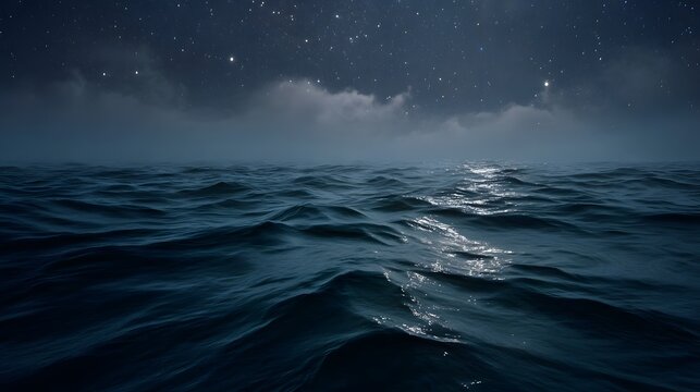 A vast ocean under a starry night sky with dramatic clouds and moonlight reflections