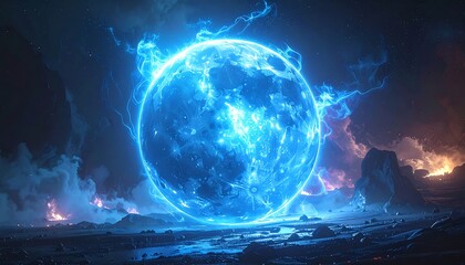 Glowing Blue Sphere Surrounded By Clouds And Stars In A Dark Night Sky With A Mystical And Ethereal Ambiance