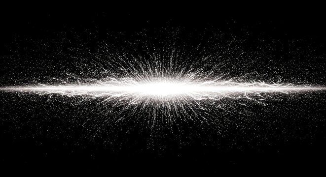 A blue burst of light emanates from a central point, surrounded by a starry field