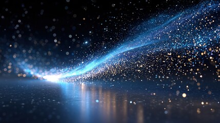 Dynamic abstract stream of blue and gold sparkling particles flowing across a reflective dark surface, modern technology background