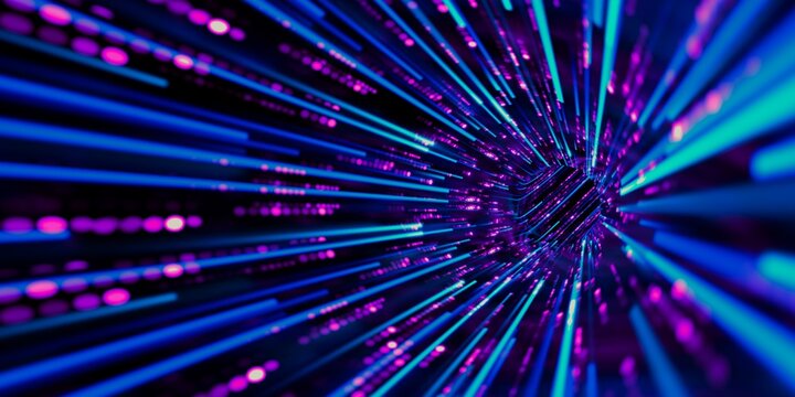 A vibrant, abstract digital artwork depicting a neon-lit tunnel of speed. Swirling lights in dynamic streams create a sense of movement and cosmic exploration