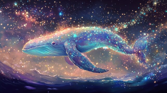 A colorful, cosmic whale swims through a starry ocean, blending elements of fantasy and the beauty of marine life.