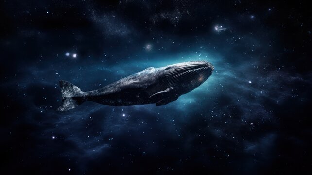 Majestic blue whale swims through a celestial sea of stars and nebulae