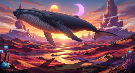 Enormous cetacean soars over a vibrant, otherworldly desert landscape during twilight