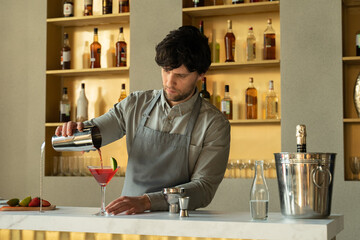 Bartender pouring Cosmopolitan cocktail in martini glass