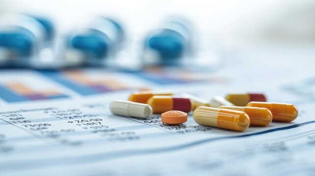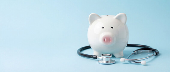 Smiling male doctor wearing blue scrubs and stethoscope overlaid with declining market charts