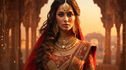 a beautiful Indian bride is in traditional Indian costume with Kundan jewellery, romantic