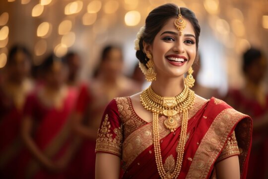 A young Indian ethnic woman with a smiling face wearing traditional bridal costumes and jewellery