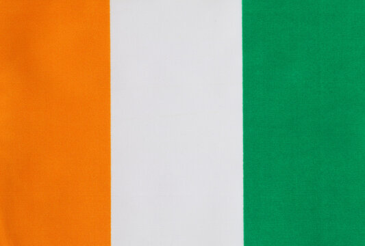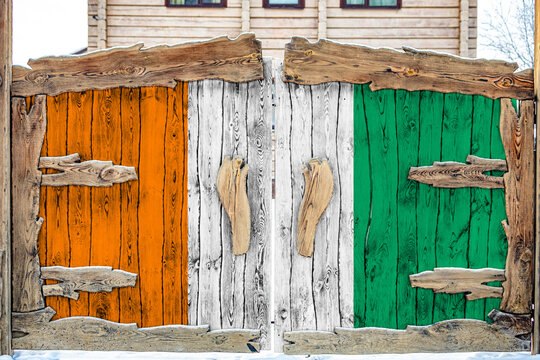 Close-up of the national flag of Cote d'ivoire on a wooden gate at the entrance to the closed territory. The concept of storage of goods, entry to a closed area.