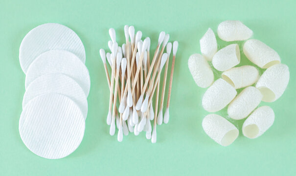 Cotton cosmetic removers and skin care products pads, cotton swabs, silkworm cocoons