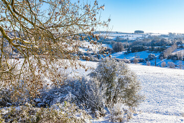 The source of the River Frome in early winter snow on the Cotswolds viewed from the churchyard at Brimpsfield, Gloucestershire, England UK