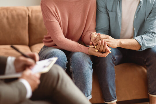 Help Concept. Closeup Cropped View Of Spouses Having Session With Man Marriage Therapist, Sitting On Couch In Office And Holding Each Other Hands. Consultant Writing Taking Notes, Selective Focus