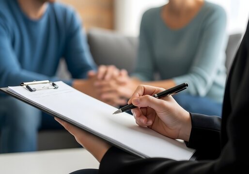 Professional counselor taking notes during therapy session with couple, relationship counseling and psychological consultation concept in modern office with emotional support and guidance.
