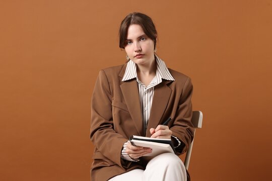Psychologist taking notes during therapy. She sits on a yellow sofa and looks at her client. She pays attention to her body language, which radiates kindness and friendliness.