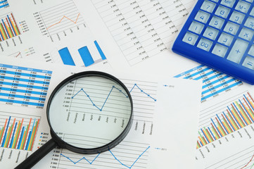 Business concept, calculator and magnifying glass on financial charts and graphs