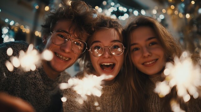 stylish young people celebrating New Year 2026 with sparklers, modern backdrop with silver and gold tones, cinematic lighting, minimal clean background.
