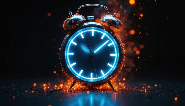 Futuristic alarm clock with glowing blue face and burning orange embers. Time concept represented by a retro clock emitting light and sparks on a dark backdrop.