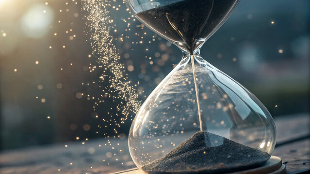 Glass hourglass with blue sand placed on sparkly surface in soft light