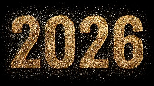 Sparkling numbers 2026 shine brightly against black background with golden glitter effect